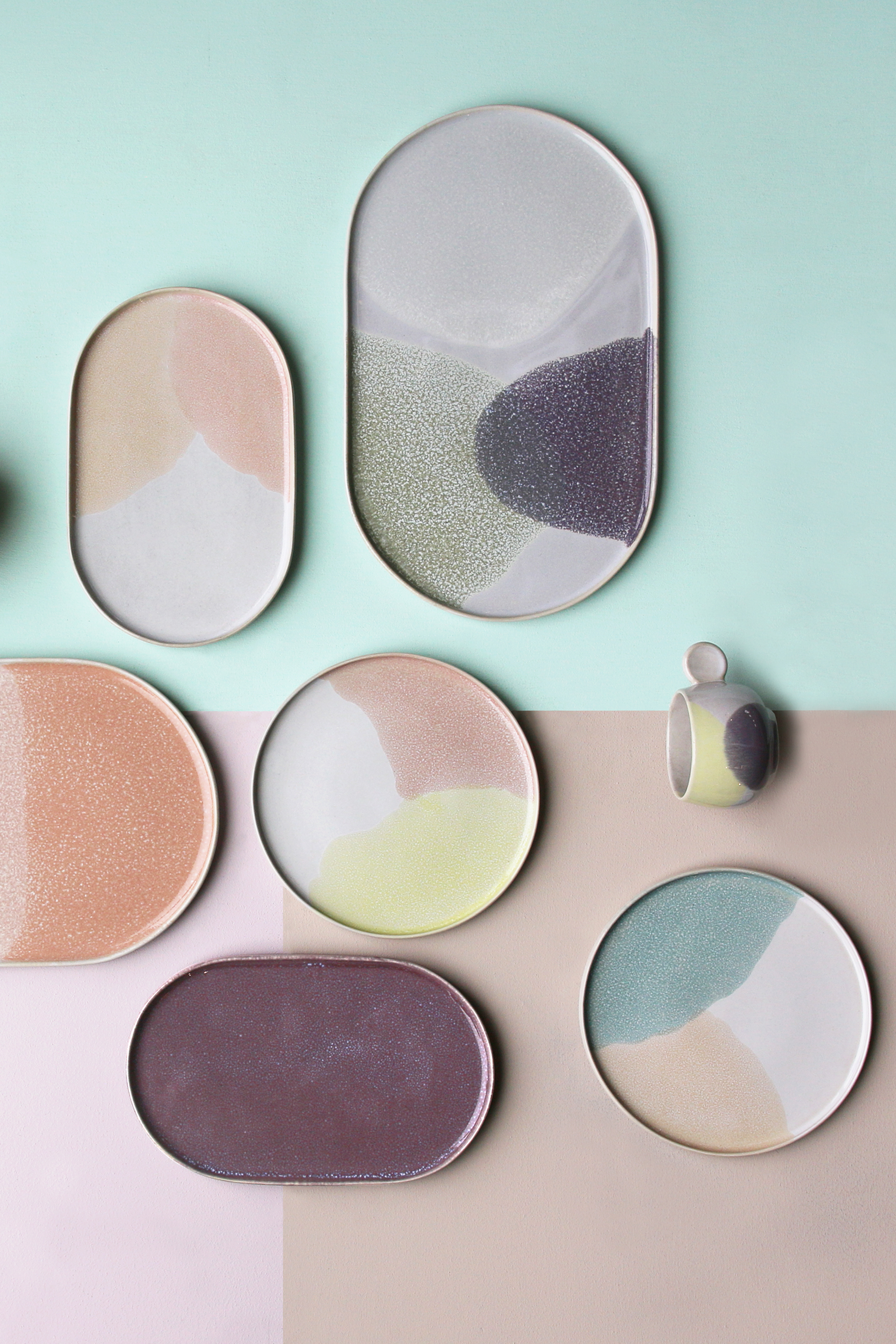 Los muebles curvos y los tonos empolvados fueron lo más destacado de los años ochenta. Inspirándonos en esos elementos, creamos una combinación divertida de vajillas con formas orgánicas.