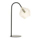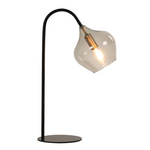Lámpara de mesa Rackel de cristal con base metálica color negro mate. Su pantalla de vidrio aporta de manera sutil y elegante a tu mesa de luz o escritorio. Su estructura fina y superficie transparente permite que la luz caiga de una manera muy limpia a tu mesa.
