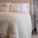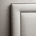 El respaldo Marco y Tachas cuenta con un borde doble de tachas redondas en color gris o dorado envejecido, cuenta con una estructura de madera aglomerada con marco de pino, espuma y napa, tapizado con la tela elegida y la trasera va con forro de trevira (poliéster con algodón), lo puedes encontrar en una gran variedad de colores en Lino, Algodón y Gamuza.